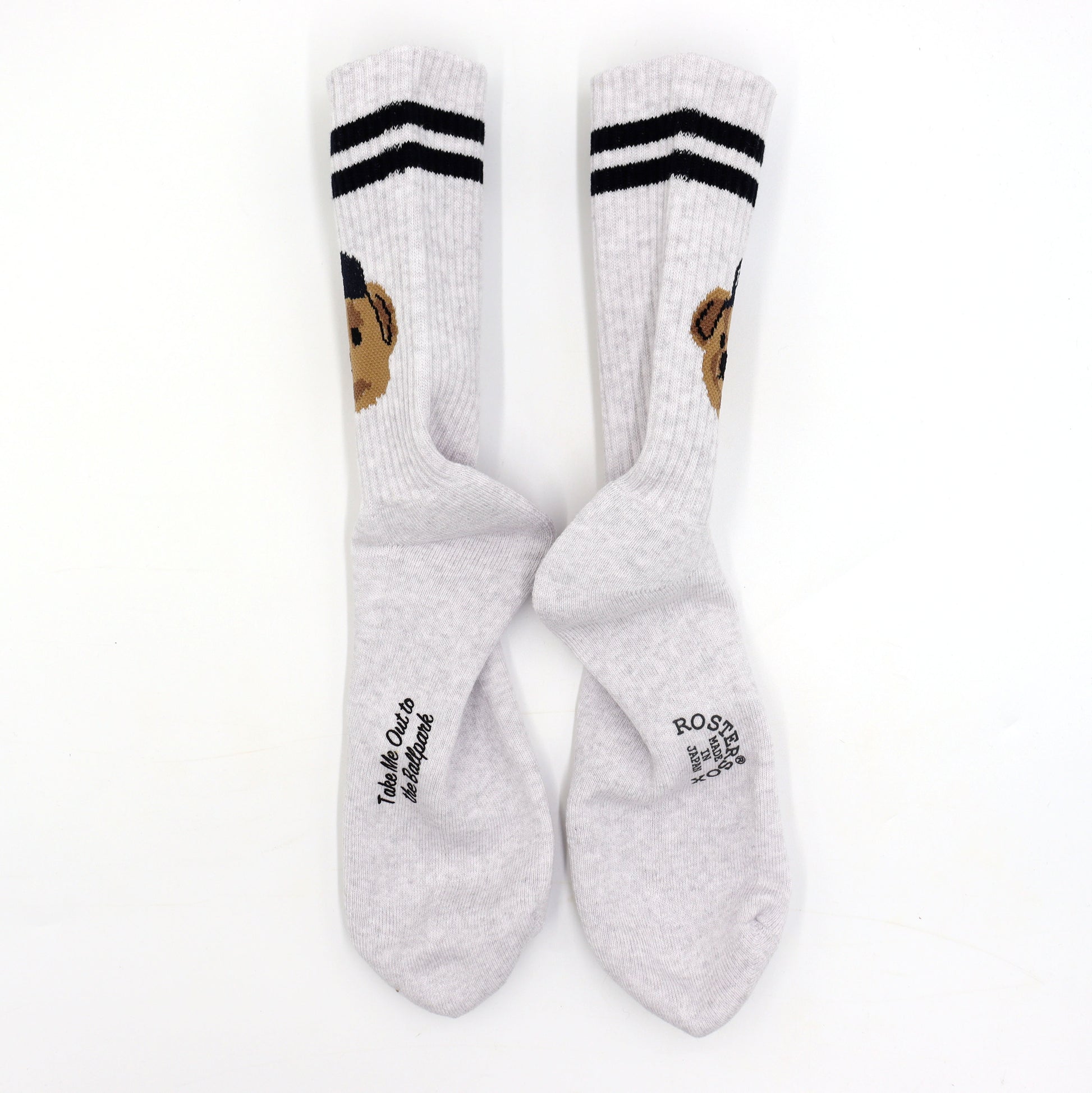 These fun socks feature a bear wearing a hat, with the two stripes at the cuff matching the hat color for a coordinated look. The toe is detailed with “TOKYO, EBISU”, adding a subtle city vibe.