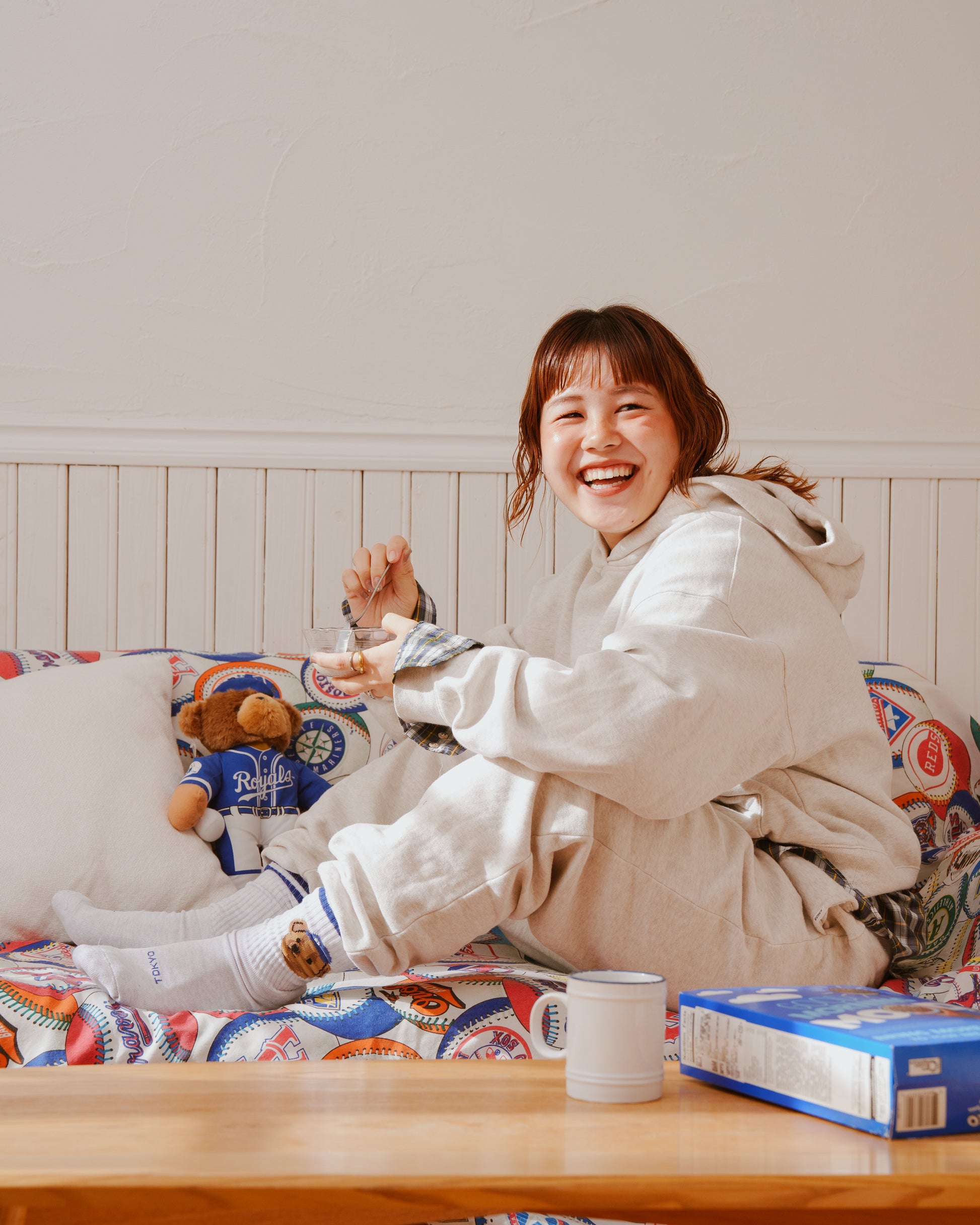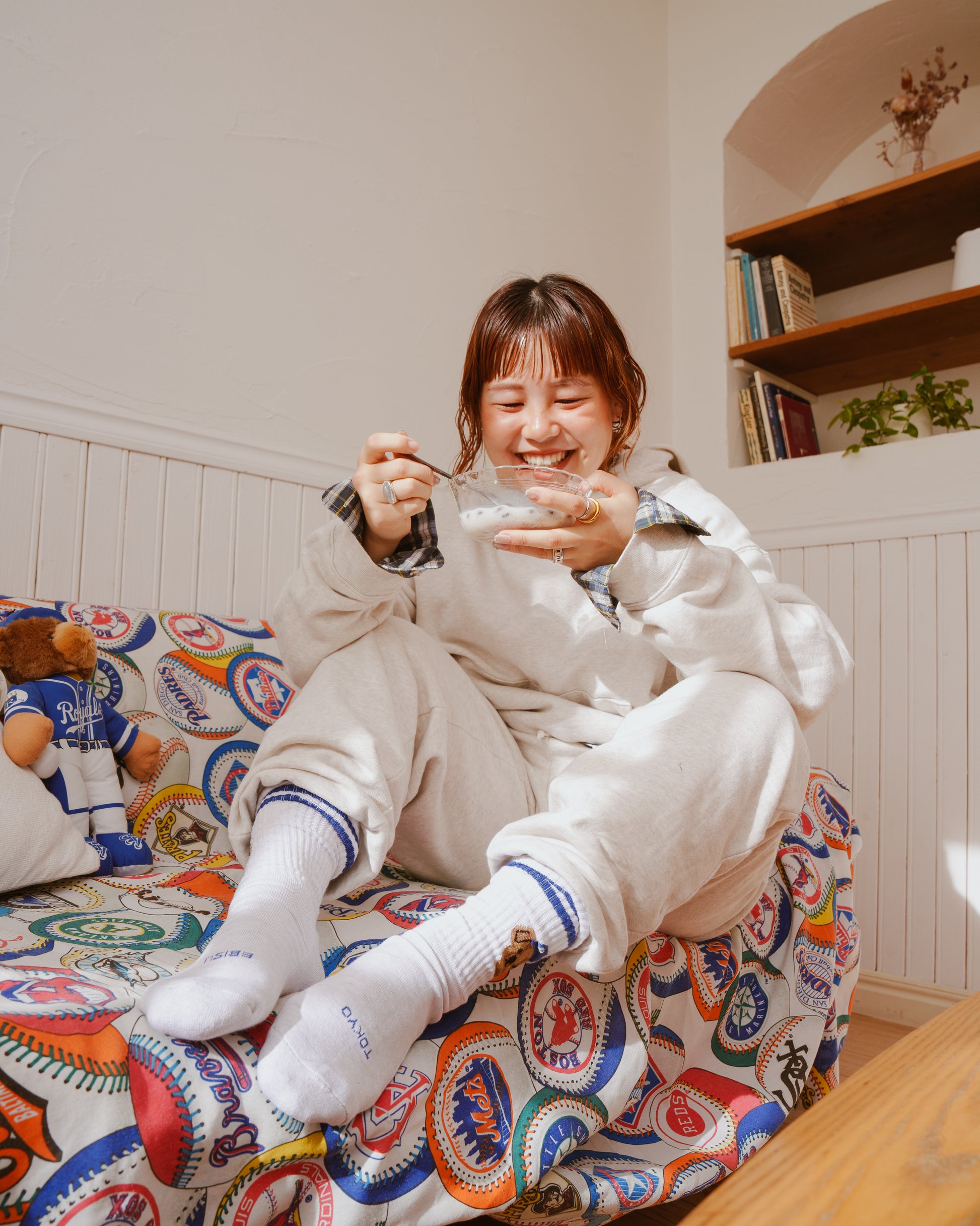 履き口の2本ラインとベアーの帽子は同じカラーで統一感を。つま先には「TOKYO, EBISU」の文字入りで、さりげなく街の雰囲気もプラスしています。